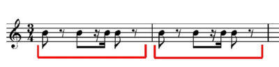 また、交響曲第8番の第3楽章のトリオは、表向きには普通の優雅な民謡風ですが、裏のリズムパートは「フリアント」の2小節単位の3拍子だと思うのです。優雅なメロディに対比させたちょっと緊張感のある引っ掛けリズム、という捉え方もできますが、ドヴォルザークが意図したのは、もっとゆったりした大きな3拍子だったのではないでしょうか。大きな3拍子のリズムと考えると、このリズムパターンも優雅なものに聴こえます。(譜例5がオリジナル、譜例6はその3/8拍子のリズム2小節分を3/4拍子1小節に書き直したもの)