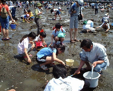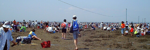 潮干狩り(千葉:富津) 5月/天気のよい大潮の日、潮干狩りに出かけた。 車・車・車の渋滞。 人・人・人の混雑。 往復12時間かけて、わずか30分の潮干狩りを楽しみました。 時間を贅沢に使ったような、そうでないような・・・楽しい一日。 我が家のページに戻る