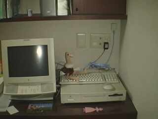 なお、現在他の部屋のパソコンは1Fに68KシリーズのMAC=7100AVしかないため、LANケーブルもそこしか通線していない。右の写真がMACであるが、裏の情報コンセントを見せつるためにモニタを動かしてある。キーボード上の鳥は米国では長年親しまれるキャラクタだと売店のおばちゃんに言われたが何のシリーズなのだろうか?ご存知の方は教えてほしい。S/T in