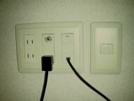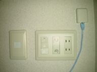 また、各部屋には3連の情報コンセントが用意されている。神保電機の標準品はACコンセント×2口、6芯の電話モジュラ×1、TVジャック×2という具合である。この6芯のモジュラの使い方がディーラの説明ではよく分からなかったが、S/T系が必要とする信号線は4本で、アナログ系が使用する信号線は2本であるから、モジュラに接続する時にS/T系とアナログ系で使用するピンを変えて誤挿入による事故を防ぐのだろう。プラグを差し替えることによりS/Tとアナログを使い分けるということであろう。TEL線として支給される部材(ケーブル)が8芯であることからすると、2芯余るわけでもったいない。webmasterの方が8本全部を使用するので利用効率が高く、貧乏性が現れていると思う。このような使い方をするため、パネルを取り外してモジュラジャックを1口から3口へ変更した。但し、1個はISDNと印字されたRJ45のモジュラである。モジュラを増やしたのでパネル蓋をしたら増やした分が見えなくなる(というかまず閉まらない)。そこで、パネルをカッターで気長に線引きを繰り返して穴を広げることになった。