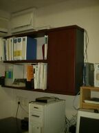 書斎には、他の部屋と同様に情報コンセントが用意されている。また、スター型で配線する信号の基点であるため、基点をまとめて収容する露出型の情報盤を天井付近の壁に取り付けてある。採用したのは松下電工の露出・半埋め込み型フリーボックスBQS480110W(325x480x110:定価\12800)である。オプションで露出化粧枠というのがある。フリーボックスの現物を見れば側面の壁に接する方が一回り小さくなっている。この部分を壁内に埋め込むようになっているのである。埋め込まない場合にこのひとまわり小さい部分をカバーするようなものであるが、別に見た目は悪くないし、リビングにおくわけでもないので使用しないことにする。このフリーボックスであるが、好みで露出、埋め込み型、半埋め込み型も選択可能である。以前、メールを頂いたyokoyama氏は業者に依頼して、壁と同一材料で埋め込み型の情報盤を作ってもらったそうである。美観の面ではこちらの方が優れているだろう。こういった情報盤メーカは他にもあり、日東電工なんかが有名である。こちらは”ホームページに福岡の営業所の連絡先が書いていない”とメールしたら、カタログを送ってきてくれました