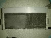 で、掃除機をかけてみたわけだが、下の写真は半分だけ掃除機をかけたところである。埃がたまっていることがはっきり分かる。手入れをしない換気システムがいかに汚れをばらまくことになるか想像できると思う。フィルタ本体の溝の間の汚れ落しには使わなくなった歯ブラシが有効である。力の加減に注意してフィルタをおらないようにして埃をかき出して吸い取ればかなりきれいになる。