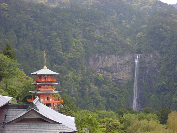 那智大社のそばにある三重の塔と滝の2ショット。