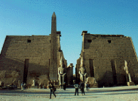 外から見るとかなり廃墟な雰囲気が漂っていたが、中に入るとそれほどでもなかった。第一塔門の前(写真中)にはオベリスクが建っていて、そのうち1本は現在パリのコンコルド広場(1819年〜)に建っている。第一中庭(ラムセス2世の中庭)には三つの礼拝堂(写真右)があり、その周りにはラムセス2世の立像と柱(砂岩)が交互に並んでいる。今では立像はかなり少なくなっているが・・・・。