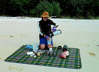 朝起きて、船底の大部屋の人に寝心地を聞くと、そんなに悪くないとのこと。ただ狭くて寝返りがうてなかったとのこと。昨夜9時頃、アンカレッジのビーチの一番端(北)のところまでボートで行き、土ボタルを見たとのこと。私たちはボートのため、何もできないと思い、8時くらいにベットに入っていた。暴睡中のため、ノックされたのも気づかなかったようだ。朝食は、シリアルや食パン。ランチ用のサンドイッチは自分で作った。