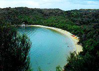 シーカヤックは初めての私でありますが、すぐに慣れました。ガイドのJOBYが島の由来などを説明してくれましたが、ほとんどわかりませんでした。1時間ほど漕いだら浜辺(たぶんAppletree Bayあたり。写真左下 今回の旅行での一番のお気に入りショット)にカヤックをつけ、暖かい飲み物とクッキーなどをいただきました。ここで小1時間ほど過ごしました。再び漕ぎ出してしばらくすると、マッドマイルと言われるシーブリーズが吹くところを進まなければなりませんでした。サングラスをしていなかった私は、波の直撃を受けてしまいました。日よけもさることながら、水よけに必要かもしれません。風は冷たくないものの、やはり小さなカヤックにしては、波が大きいのでいつ転倒するか心配でした。13:00にTe Pukatea Bayに着きました。ここでお昼を取りました。バーガーとマフィンそれに飲み物でした。今日の風の強さを聞くと、Middleとのこと。先週は2、3日強い日があり、数台カヤックが転倒したそうです。途中で雨が降ってきたので、屋根代わりのシートをオールで支えました。お昼を終わったら、JOBYが20分ほどウォーキングしようと言って、Te Pukatea Bay(写真右下)がきれいに見えるところに連れってくれました。ずっと、広角レンズで撮っていると思っていたけど、本当にきれいな弧を描いた湾でした。ここをトレッキングルートにしていたら気づかなかったことでしょう。Te Pukatea BayからPitt Headに向かっていけば、10分もしないうちに見えてきます。JOBYは後ろを全然気にせず、どんどん歩いていきます。背後のドイツ人から「おれたちゃ、リチャード・キンブル(「逃亡者」の)じゃないんだぞう。これじゃ、ウォーキングじゃなくて、逃げてるみたいだ」という叫び声が聞こえてきました。
