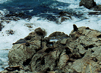 ネルソン発8:00のバス(38NZ$)でカイコウラに向かった。進行方向左側に座ると海沿いを眺められるのでいいかも。ブレナイムというところで降ろされ、1時間30分ほど乗り継ぎ時間があった。カイコウラにバスが到着する20分くらい前にオットセイのコロニーがあり、バスの運転手さんが5分くらい写真撮影の時間をくれた。