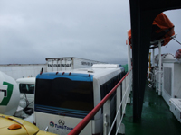 8:40にピックアップの予定だったが、ピックアップに来なかったので、電話をかけてもらったら、違うホテルに行っていたようだった。9時すぎにピックアップに来てくれた。ツアーのほとんどの客は、プエルト・バラスからの旅行者のようだった。バスは、1時間ちょっと走り、港に到着した。乗りこぼしで、次の船になってしまいましたが、チロエ島への船は結構頻繁に出ていました。振り向くと、後ろには長蛇の車の列が出来ていました。10:20分にフェリーに乗船した。船には席はなく、甲板?で過さないといけない。天井があるところも少ないので、雨、風をまともに受けます。11:00にチロエ島上陸した。
