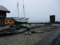上陸すると、ウロコ状の板の壁の家がいっぱい見えてきました。 30分ほどバスを走らせ、まずは、アンクーのサン・アントニオ要塞に行き、その後、アンクー博物館(600チリペソ)に入場しました。外には、古いシロナガスクジラの骨が展示されていました。