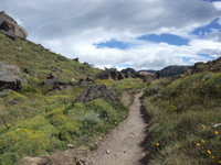 トレイルは1列でしか歩けない幅なので、結構狭い。途中で二手に分かれているが、カプリ湖のほうに行く道を選んだ。この看板が出ているところから、20分ほどで、カプリ湖に着く。