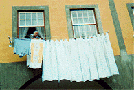 上を見上げれば、色とり取りの窓枠のあるアパートが密集している。その窓から洗濯を干しているおばちゃんを見つけた。ポルトガルの洗濯の干し方は不思議である。洗濯の紐に普通は、シーツなどは2つ折りにして掛けるところを折らずに、紐とシーツの端を20cm間隔ぐらいで、洗濯ばさみでとめていくのである。おばさんは風と対抗して、必死にシーツを押さえながら洗濯ばさみでとめていた。すごい面倒くさいことやってるなあと思って見ていると、案の定洗濯ばさみをおとしてしまった。