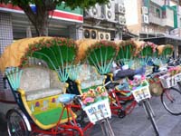 旗津半島は200mの幅しかないので、5分も歩くと、反対側の海に出てくる。海に面した道路沿いには、魚屋さんや乾物屋さんや、食材を選んで食事ができるお店などが並んでいる。店先ではイカを焼いていたり、ちょっとつまみたいけど、お腹が空いていないので、諦める。 旗津輪渡站の前のセブンイレブンの右側には、旗津名物の人力三輪車が停まっている。この街全体の雰囲気が気に入った。