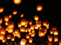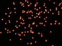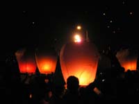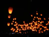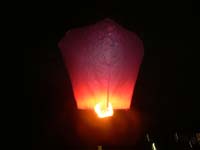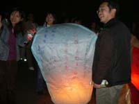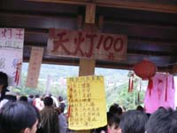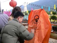 願いを天燈に書いて、天燈を広げ、天燈の下に火をつけ、天燈の中が充分温まったら、手を離して飛ばします。写真を見たら、吊っているように見えるかもしれませんが、天空に飛ばすのです。天燈の下に爆竹や、花火をつけているのも見かけました。ときどき、木にひっかかって、木が燃えたりしています。