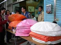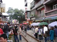 12日の平溪(ピンシー)天燈祭の会場は、十分天燈広場でした。台北から通勤電車(16:04発 52元)に乗り、瑞芳で下車、そこで再び十分まで切符(21元)を買う。時間があれば大華駅で下車して、十分瀑布を経由して、十分に行こうかとも思っていたが、瑞芳駅には、既に人があふれかえっていた上、菁桐行きの電車も15分遅れていたので、そのまま十分に行くことにした。大華駅あたりでは、線路を歩いている人が何人かいた。また、十分に歩いていくのだろうか、川沿いにすごい人の列。十分駅に着くとあふれんばかりに人がいた。店先ではここかしこと、天燈が売られている。天燈は色によって、ご利益が違うみたい。