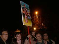 人の流れにそって進み、十分天燈広場に行きました。ここでは、歌手や野球選手などが来て、その人たちが大きな天燈に願いを書き、一斉に天燈を上げる人たちと一緒に飛ばします。下の真ん中の写真は、2人1組で列に並び、天燈を飛ばす人たちの写真です。
